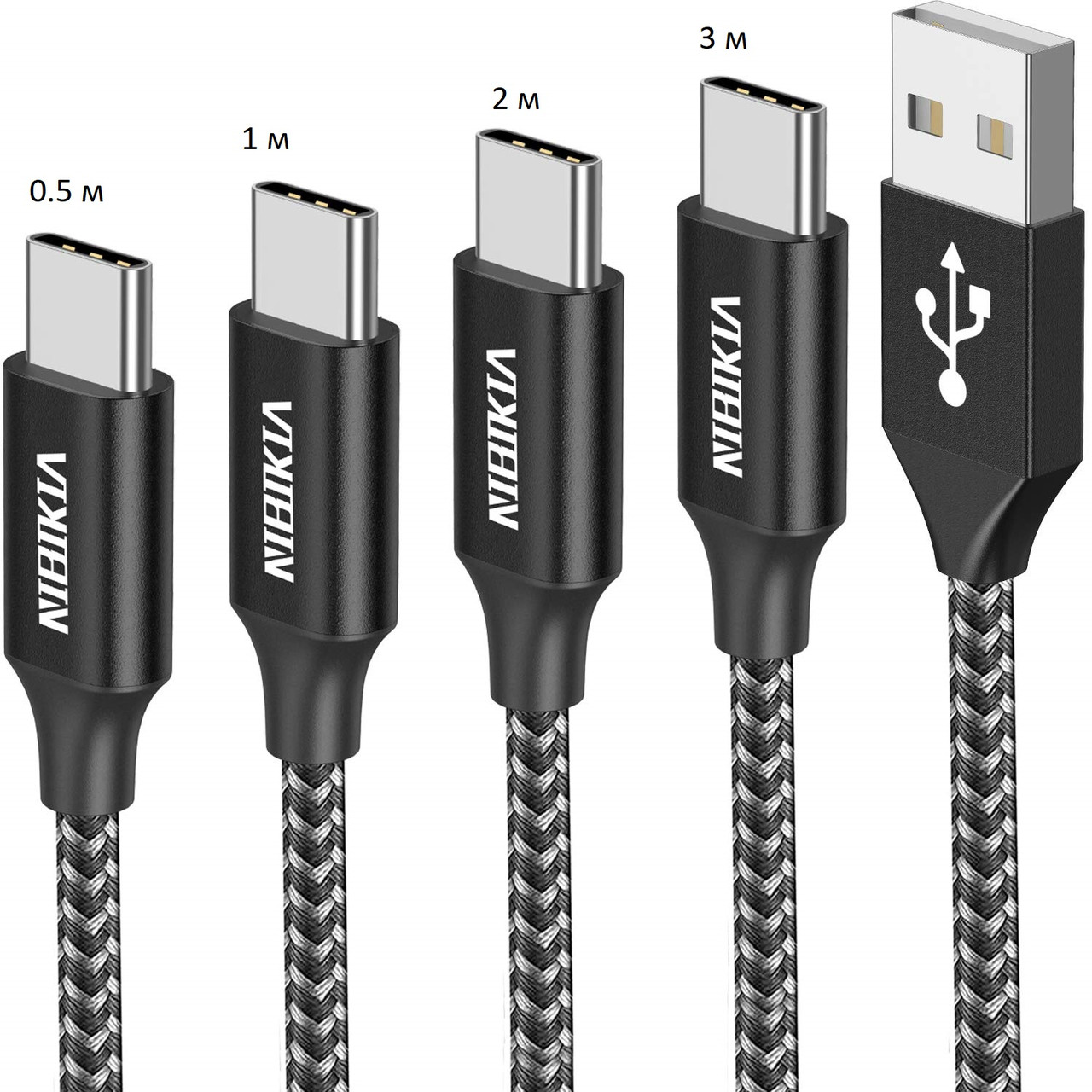 4 кабелі довжинами 0.5 m + 1 m + 2 m + 3 m, USB-A - USB-C 2.0 з нейлоновою опліткою преміум-класу